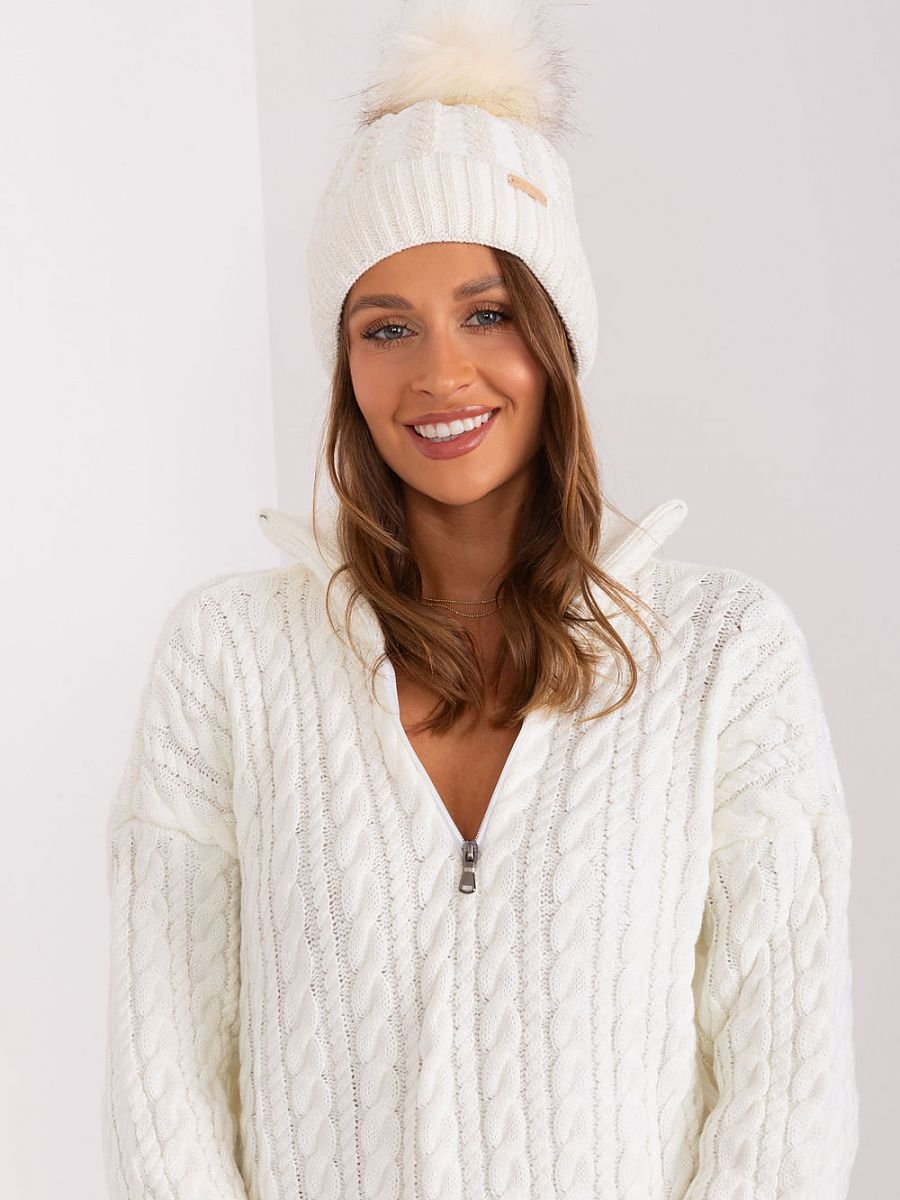 Women's winter beanie with turn-up, decorative plaid weave and pom-pom.